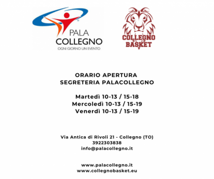 Si comunicano gli orari aggiornati di apertura della segreteria del PalaCollegno: